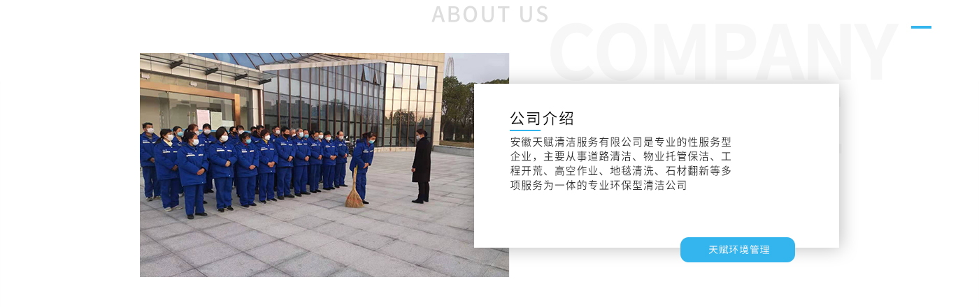 安徽天賦清潔服務有限公司是的服務型企業,主要從事道路清潔、物業托管保潔、工程開荒、高空作業、地毯清洗、石材翻新等多項服務為一體的環(huán)保型清潔公司。公司管理機制完善,清潔作業經驗豐富,擁有技術力量,嚴格實行崗前培訓—崗中督查—上崗在培訓的員工管理措施,憑著優(yōu)良的清潔質量和嚴格的督查管理,為眾多企事業單位、醫院、酒店、廠區商場、物業、道路、學校、公園等提供后勤清潔服務。在業內擁有良好的口碑。工作人員,服務態(tài)度優(yōu),竭力為客戶提供好的保潔服務。安徽天賦清潔服務有限公司:致力于長期合作關系,提高服務質量,提供高標準的清潔服務。公司的經營理念:為營造一個更清潔、亮麗的生活和工作環(huán)境而努力!“誠信”是公司成功保證。“客戶至上,信譽為首”是公司宗旨。高標準提供服務,維護客戶利益、形象,是我始終不渝的目標。